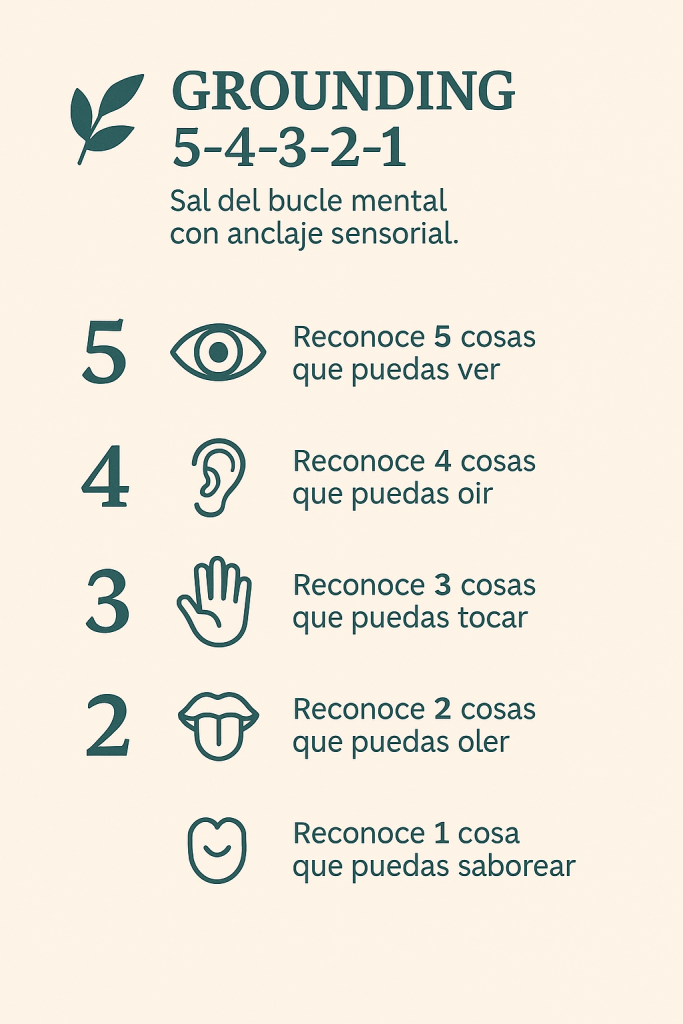 El Grounding 5-4-3-2-1 es un anclaje sensorial que te ayuda a salir del bucle mental en solo un par de minutos. Lo haremos como un pequeño juego de los sentidos: