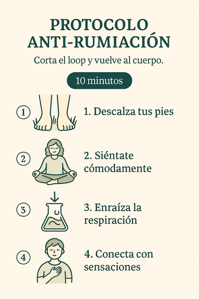 Este protocolo funciona como un corte de emergencia: respiración para calmar, movimiento para soltar, sentidos para volver al presente, acción para redirigir.